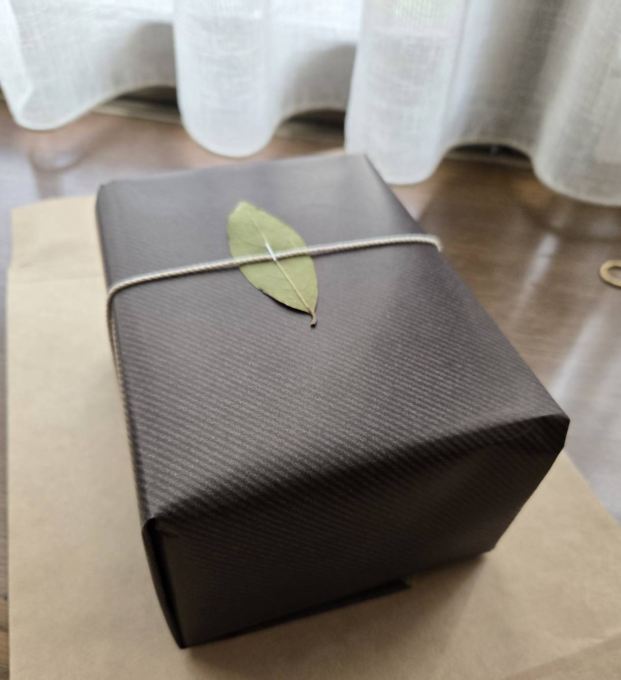 こげ茶色の包装紙でお包みし、はちみつやの庭で採れたローリエの葉押し葉を飾ります。(のし紙のご要望の場合はコメント欄に記入ください)